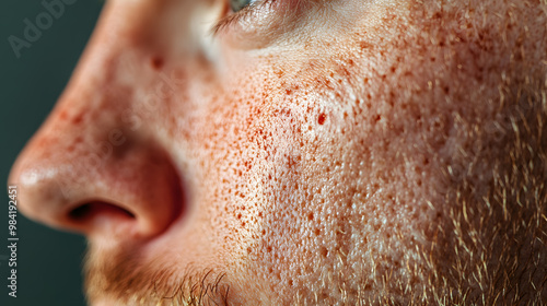 Close up face of young man suffering from problem skin. Acne, rosacea, dry skin. Dermatology concept