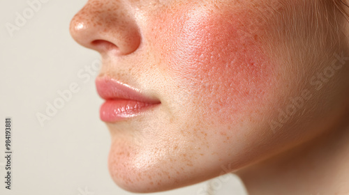 Close up face of young woman suffering from problem skin. Acne, rosacea, dry skin. Dermatology concept