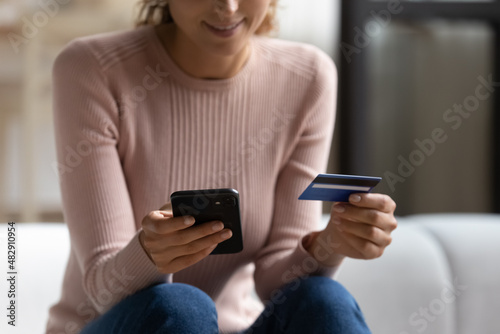 Close up female sit on sofa makes easy remote e-payment using smartphone and credit card. E-commerce client do shopping, buying goods and services on internet, easy money transfer, secure epay concept