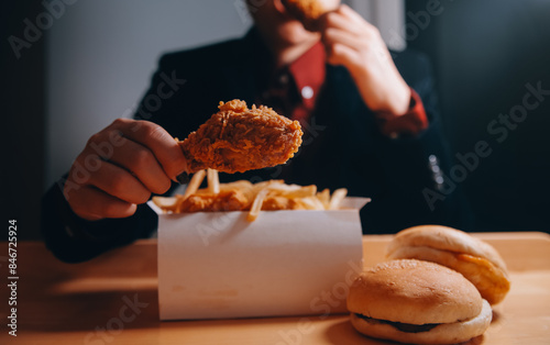 close up focus woman hand hold fried chicken for eat,girl with fast food concept