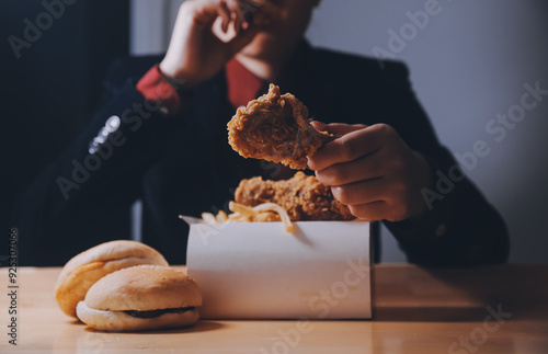 close up focus woman hand hold fried chicken for eat,girl with fast food concept