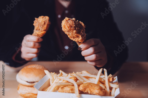close up focus woman hand hold fried chicken for eat,girl with fast food concept