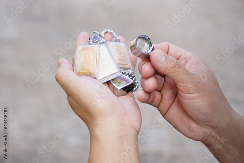 Close up hand hold magnifying glass to inspect detail and pattern tiny of amulet from collection. Concept, faith,belief in holy and luck for Buddhists. Colleting amulet as hobbies, exchange or trade.