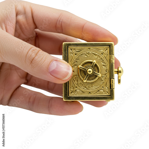 Close Up Hand Holding Ornate Miniature Gold Safe with Detailed Design PNG