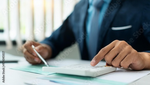 Close up hand of stress young asian businessman,male is pressing a calculator to calculate tax income and expenses, bills, credit card for payment or payday at home, office.Financial, finance concept.