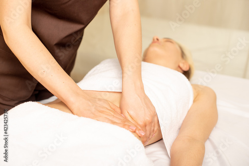 Close up hands of chiropractor or masseur making relaxing massage of stomach for lying woman in clinic interior. Professional woman doctor masseur during work with patient