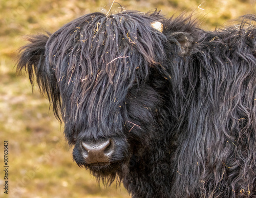 cow, cattle, bovine, animal, mammal, closeup, closeup, head shot, face, black, hairy, messy, straw, looking, wild, wildlife, nature, natural, farming, farm animal, hay, beef, meat, outdoors, remote