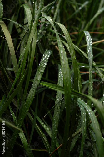 Close up image of green grass with water drops.