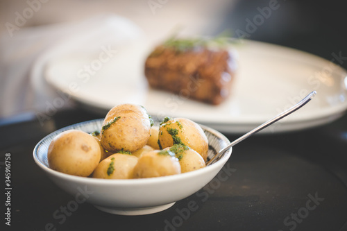 Close up images of a side of boiled potatoes being served in a gourmet restaurant