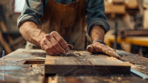 close up man owner a small furniture business is preparing wood for production. carpenter male is adjust wood to the desired size. architect, designer