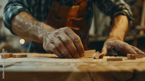 close up man owner a small furniture business is preparing wood for production. carpenter male is adjust wood to the desired size. architect, designer