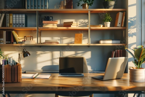 close up minimalistic Clean and tidy workspace with soft background with organized desk and shelves