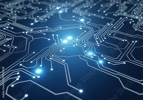Close up of a blue circuit board illustrating modern technology and complex electronic systems for data processing