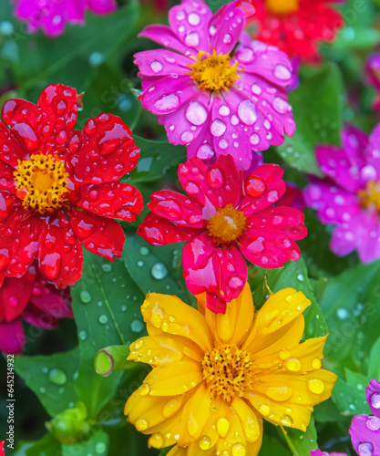 blooming, pink, detail, flower, green, growth, beautiful, yellow, day, plant, foliage, flower petals, bud, garden, moisture, aster, daisy, outdoors, horizontal, wet, flocked, garden flower, freshness, flowering plant, no people, color image, full bloom, water droplets, blurred background, grouping, flower head, in bloom, raindrop, closeup, blossom, fresh