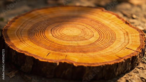 Close up of a cross section of a tree trunk showing concentric growth rings in shades of brown and yellow resting on the ground