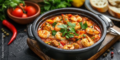 close, delicious, shrimp, stew, fresh, herb, spice, seafood, dish, food, garlic, meat, brown, low, bowl, eat, fat, black, sauce, olive, pot, serve, seed, dinner, pan, white, side, plate, kitchen, parsley
