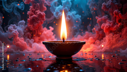 Close up of a diya lamp with a bright flame against a backdrop of colorful smoke and water droplets