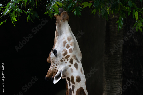 close up of a giraffe raises its head to pick leaves on tall tree branches