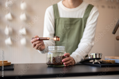 Close up of a green apron barista holding spoon scooping coffee beans from glass jar at counter bar.