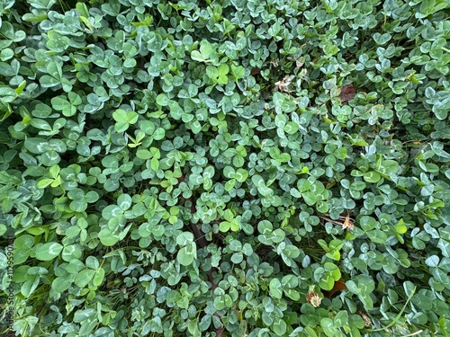 Close up of a green color Trifolium repens leaf against a bright nature background. Clover fresh leaves texture. Close-up. White clover is a herbaceous perennial plant in the bean family Fabaceae.
