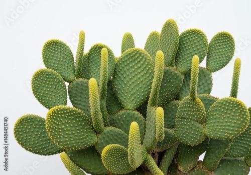 Close up of a green opuntia cactus plant with yellow spines against a white background