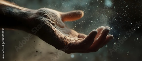 Close up of a hand covered in chalk dust with the dust particles suspended in the air against a blurred cinematic background highlighting the intense focus or action of the person