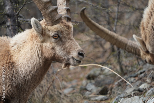 close up of a male steinbock in pontresina, graubuenden, ibex portrait close up - herd of ibexes in grisons, capricorn capra