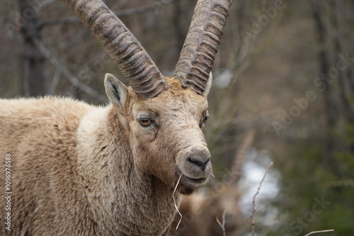 close up of a male steinbock in pontresina, graubuenden, ibex portrait close up - herd of ibexes in grisons, capricorn capra