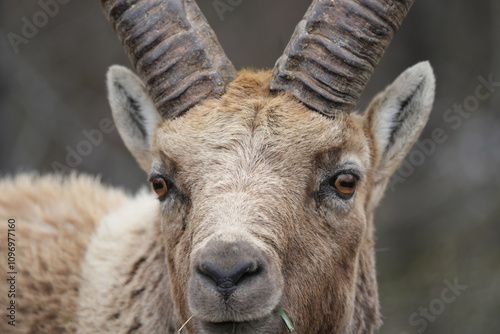 close up of a male steinbock in pontresina, graubuenden, ibex portrait close up - herd of ibexes in grisons, capricorn capra