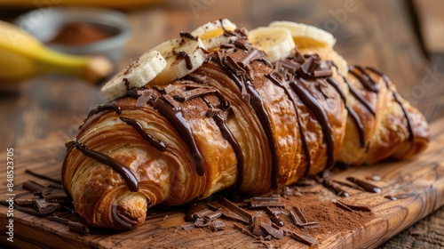 Close up of a mouth watering croissant topped with chocolate and banana on a wooden surface