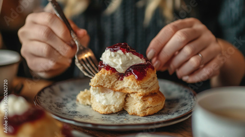 Close up of a person eating a scone with cream and jam on a decorative plate with a fork in hand