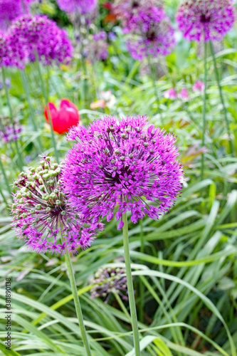 Close up of a purple allium in an English country garden