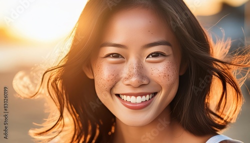 Close up of a real Korean woman's face, featuring distinct freckles, perfectly clean skin,