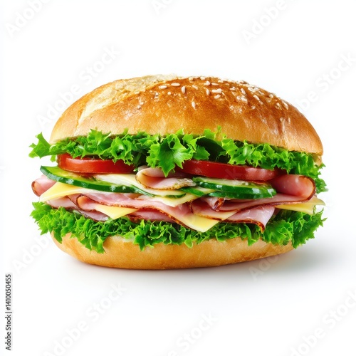 sandwich, ham, cheese, vegetable, lettuce, tomatoes, cucumber, bun, sesame, seed, food, meal, snack, lunch, dinner, fresh, healthy, delicious, diet, nourishment, cookery, white, background, close, up, isolated, studio, shot, ingredient, epicure