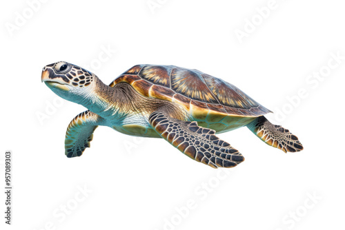 close up of a sea turtle on a white backdrop. Ideal for instructional materials on environmental issues, conservation, and marine life