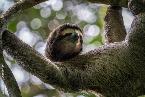 Close up of a Sloth (Folivora) hanging from a tree branch isolated on a blurred background