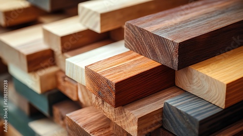Close up of a stack of various natural wood blocks showing different grains and warm earthy tones in a workshop setting