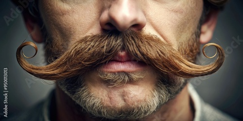 Close up of a stylish curly mustache, facial hair, grooming, barber, trendy, retro, vintage, fashion