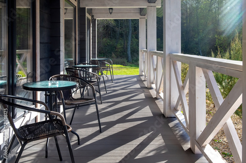 Close up of a table and chairs standing at an open area of house terrace in sunny day, close to the large windows