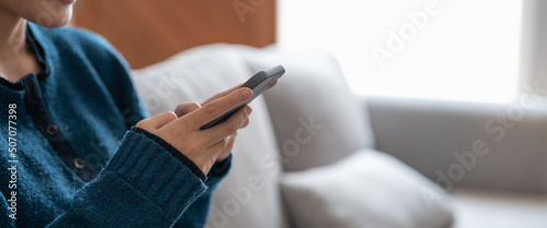 Close up of a woman using mobile smart phone on sofa at cozy home