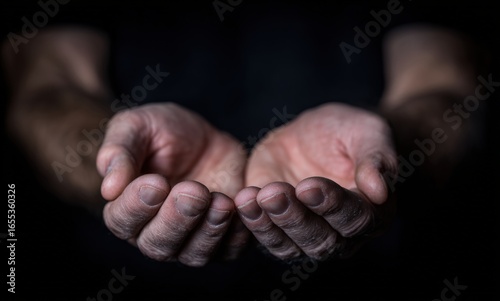 hand, dark, skin, open, texture, shallow, dirty, men at work, pleading, offering, gesture, request, help, poverty, labor, work, job, hope, charity, giving, receiving, support, wants, hardship, struggle, despair, begging, attracted, compassion, empathy, humanity, social, issue, economic, unemployment, desperation, close, up, background, cupped, grime, dirt, manual