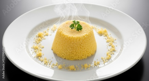 couscous, yellow, dish, parsley, garnish, white, plate, crumb, food, cookery, delicious, culinary, meal, fresh, diet, lunch, dinner, vegetarian, aromatic, grain, cook, cooking, epicure, tableware, plant, closeup, still life, fine dining, healthy eating, light meal, food photography, white plate, circle, round