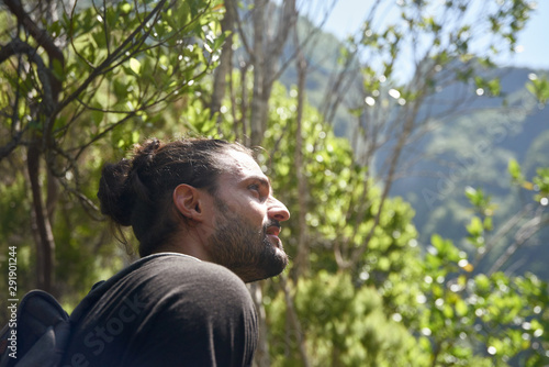 man, forest, attractive, calm, casual clothes, day, enjoy, enjoyment, female, friendly, fun, guy, jean, joy, joyful, lady, leisure, avocation, male, natural, peace, peaceful, relaxation, relaxed, sunlight, t-shirt, woman, tree, backpack, greenery, lush, moss, brown hair, long hair, beard, vale, mountain