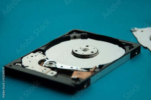 Close up of abstract image of inside of hard disk drive on blue cover background. Concept of data, hardware, and information technology.