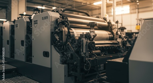 Close up of an industrial printing press machine in a modern factory setting, production and manufacturing concept for banner with copy space. Printing press machine at work.