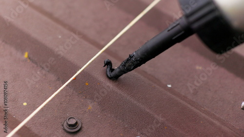 Close up of applying sealant on the roof. Carpenter repairing cabin roof of boat sealing leaks with mastic waterproof sealant