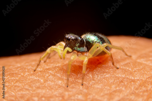 Close up of black spider on green leaf in the forest. The jumping spider with green background.