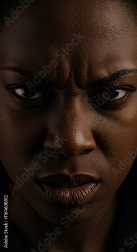 Close up of Black Woman face, Angry Upset Mad Expression, Zoom In, Zoomed Portrait