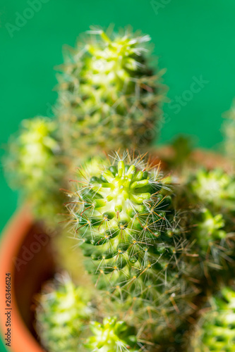 Close up of Cactus in the vase with blurred green background. Cactus thorns macro