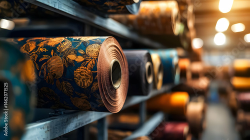 fabric, textile, pattern, storage, industrial, warehouse, manufacturing, production, colourful, gold, blue, brown, red, orange, shelf, textile industry, design, patterned, floral, closeup, detail, material, supply